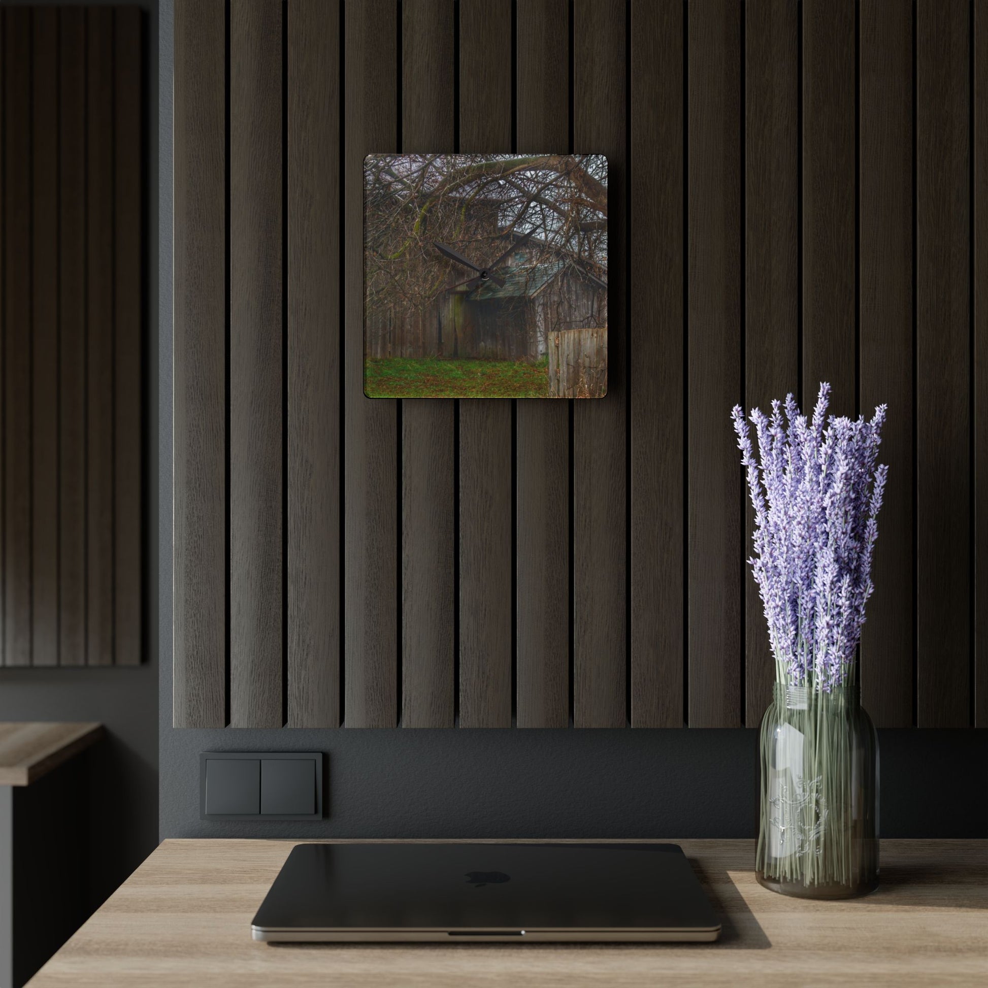 U R There Photography Bowers Road Greys III Rustic Farmhouse Acrylic Analog Wall Clock