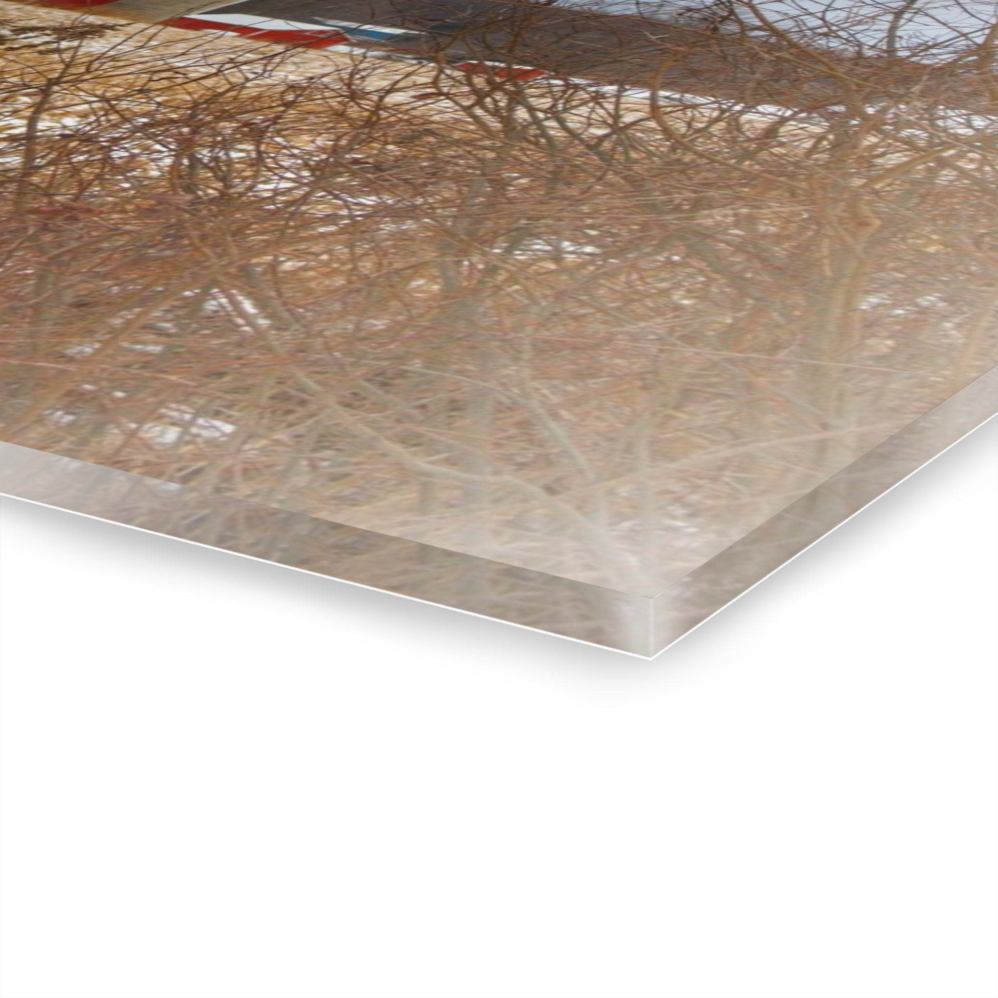 U R There Photography Brook Road Red in Winter Rustic Farmhouse Acrylic Wall Print