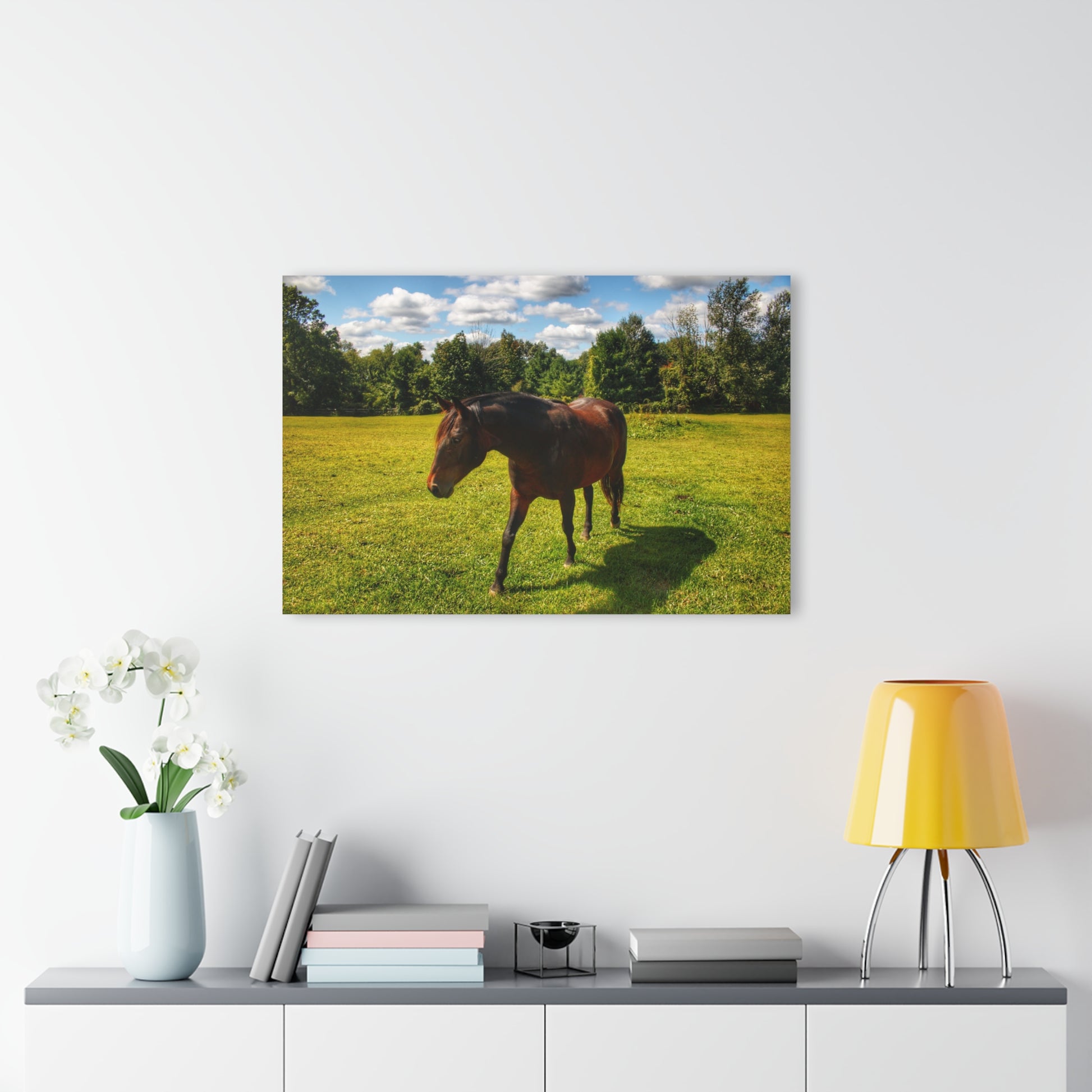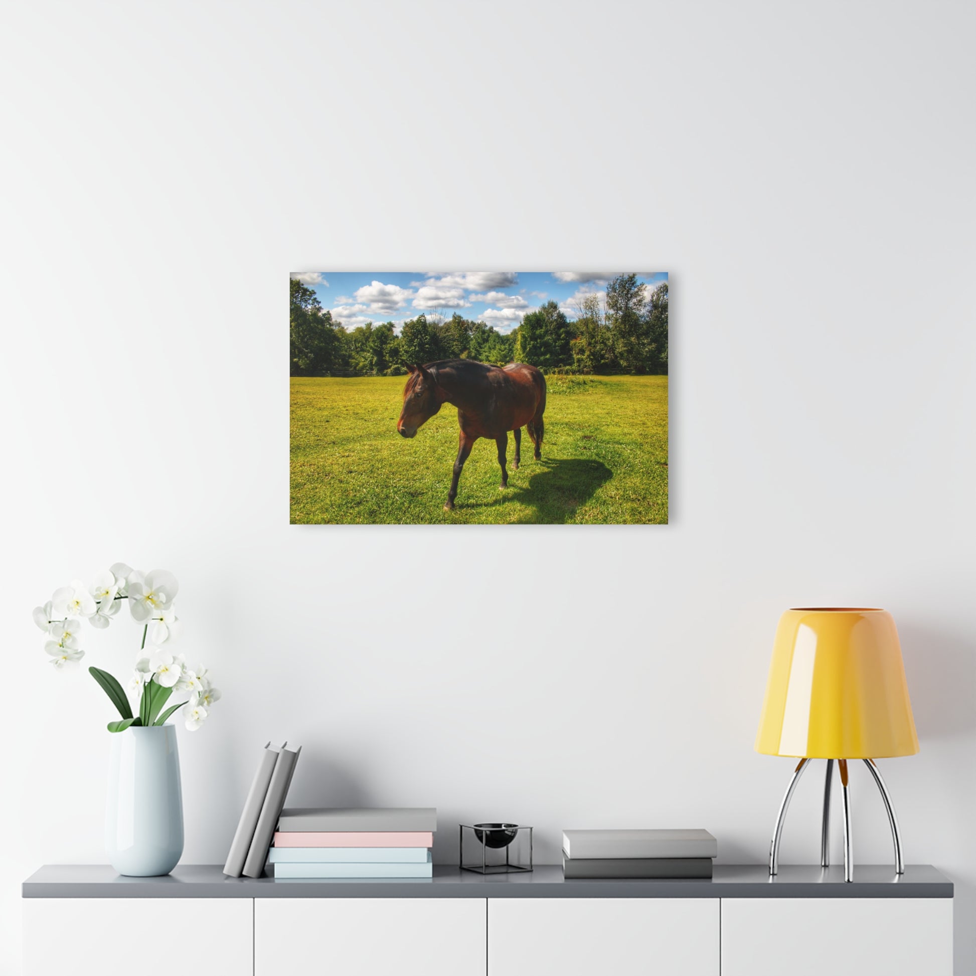 In this captivating image, a horse with a rich brown coat stands in the middle of a lush, green field. The horse, with its sleek body and well-defined muscles, exudes strength and elegance. Its coat glistens under the sunlight, showcasing a beautiful spectrum of brown tones that seem to shift with the light.