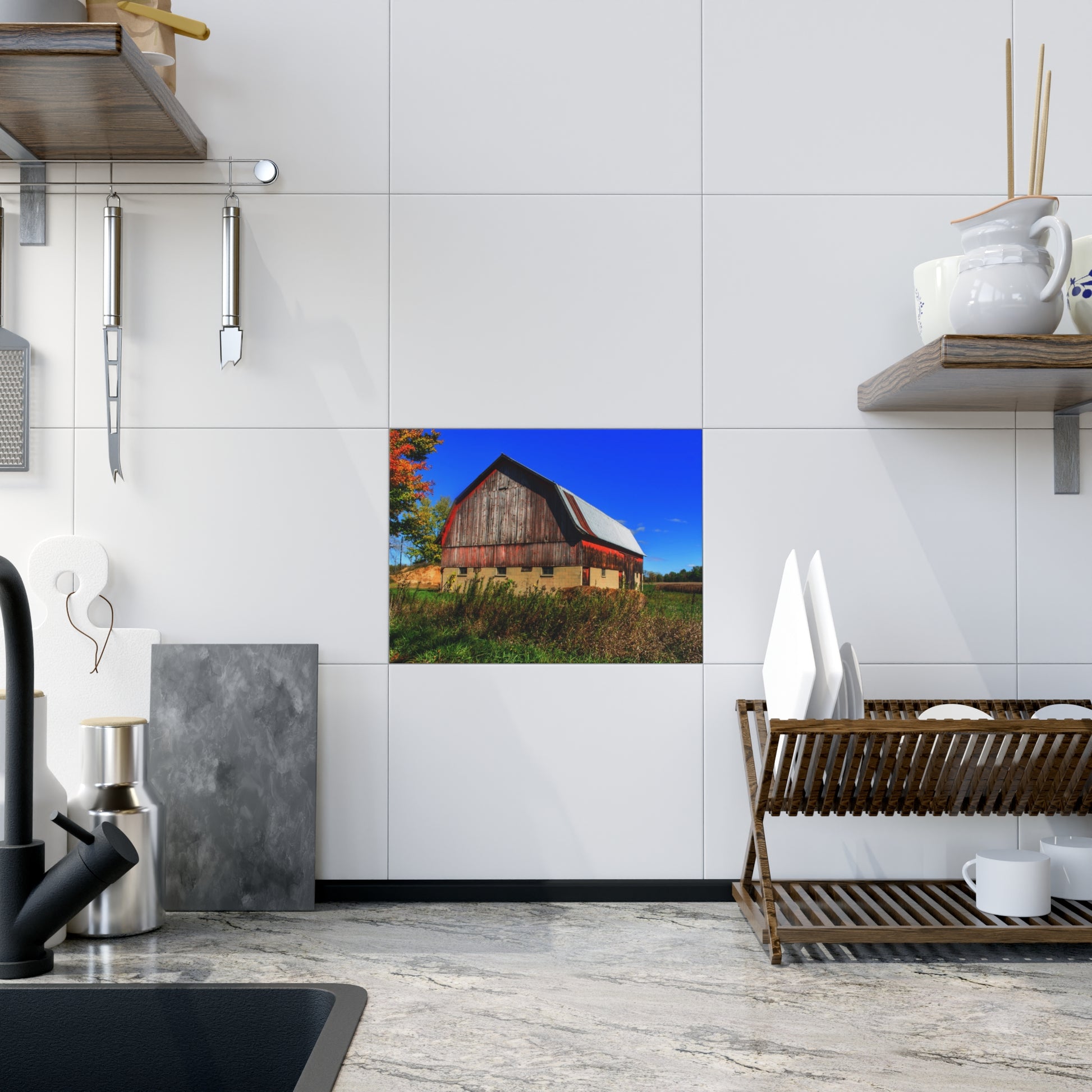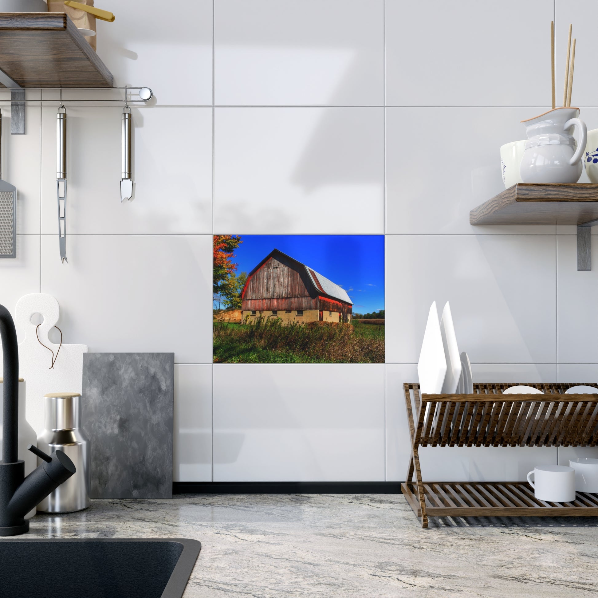 Elevate your home décor with these exquisite ceramic photo tiles featuring U R There Photography's MI Eye on the Thumb Series. Each 6" x 8" tile is a perfect blend of artistry and craftsmanship, offering full-color reproduction that brings every detail of these stunning barns to life. Choose between a glossy or matte finish to match your style and enjoy vibrant, crisp colors that capture the essence of Michigan's Thumb region.