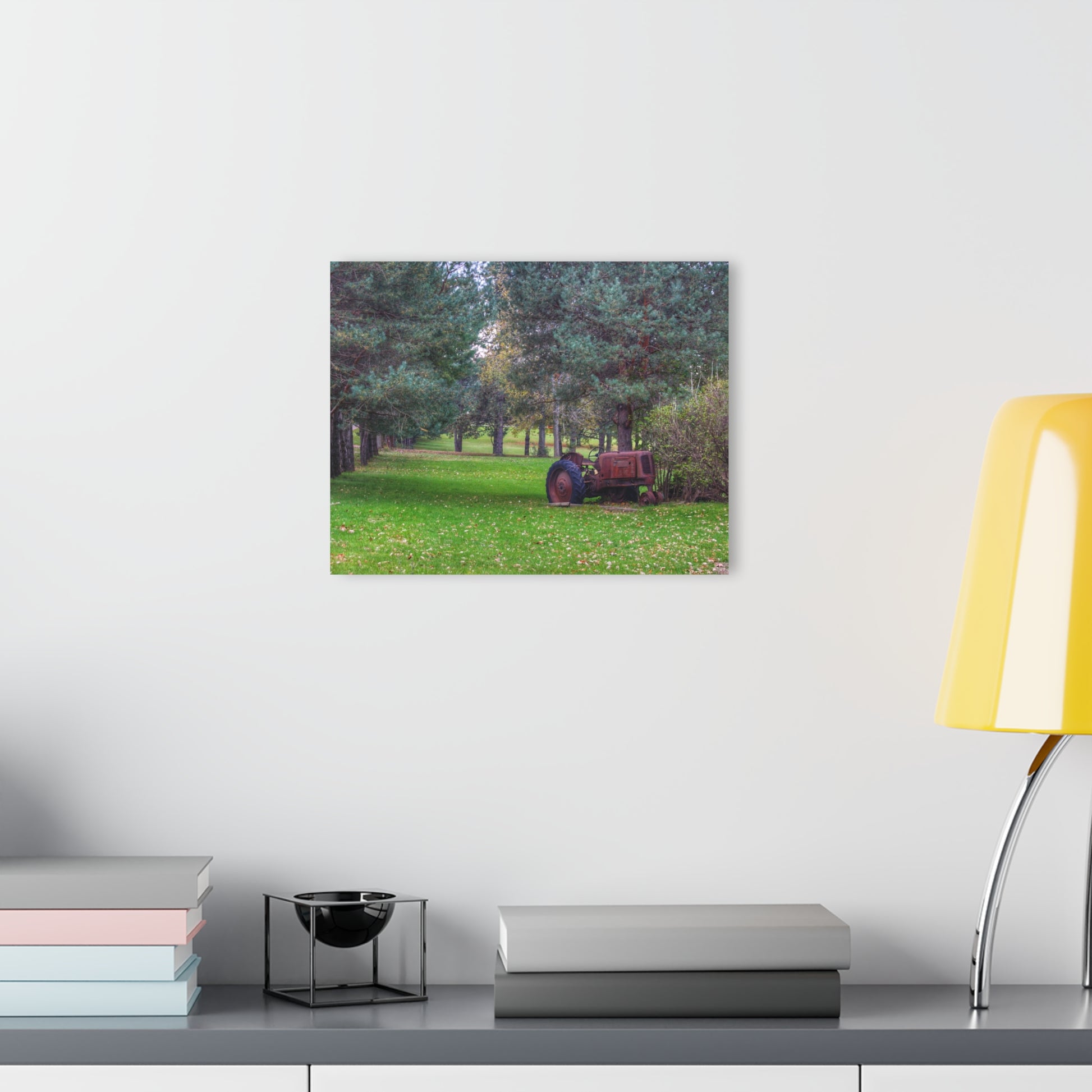 In this evocative photograph, an old, rusted tractor stands sentinel among a tranquil grove of pine trees. The machine, a relic of agricultural history, is nestled within a bed of lush green grass, contrasting sharply with its oxidized metal and worn tires. The tractor's decaying state, with its paint long faded and metal corroding, tells a silent story of years gone by, laboring in the fields now far behind it.