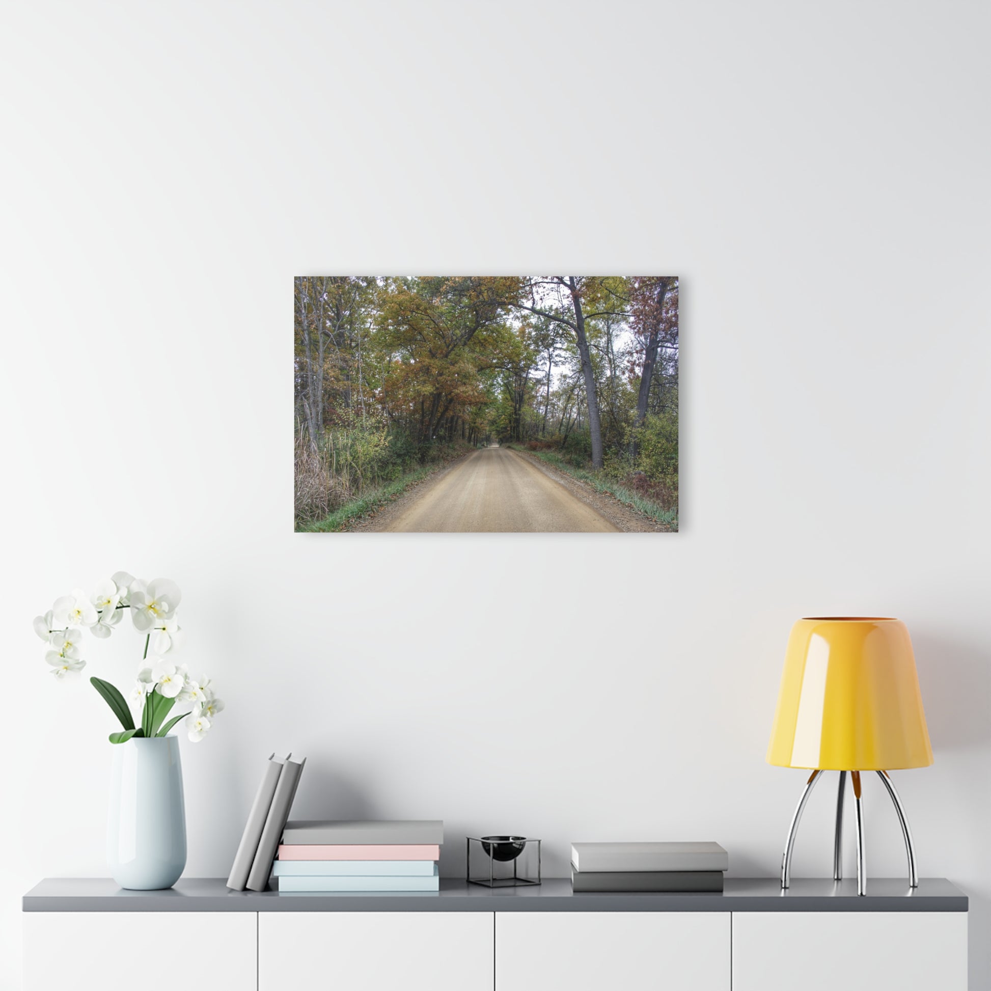 Overall, this image beautifully captures the essence of a rural Michigan landscape in fall, evoking a sense of peace and natural beauty. The combination of the unpaved road, the colorful foliage, and the overcast sky creates a harmonious and inviting scene. This photograph invites viewers to appreciate the simple, understated beauty of the countryside, reminding us of the tranquility and charm that can be found in nature's seasonal transitions.