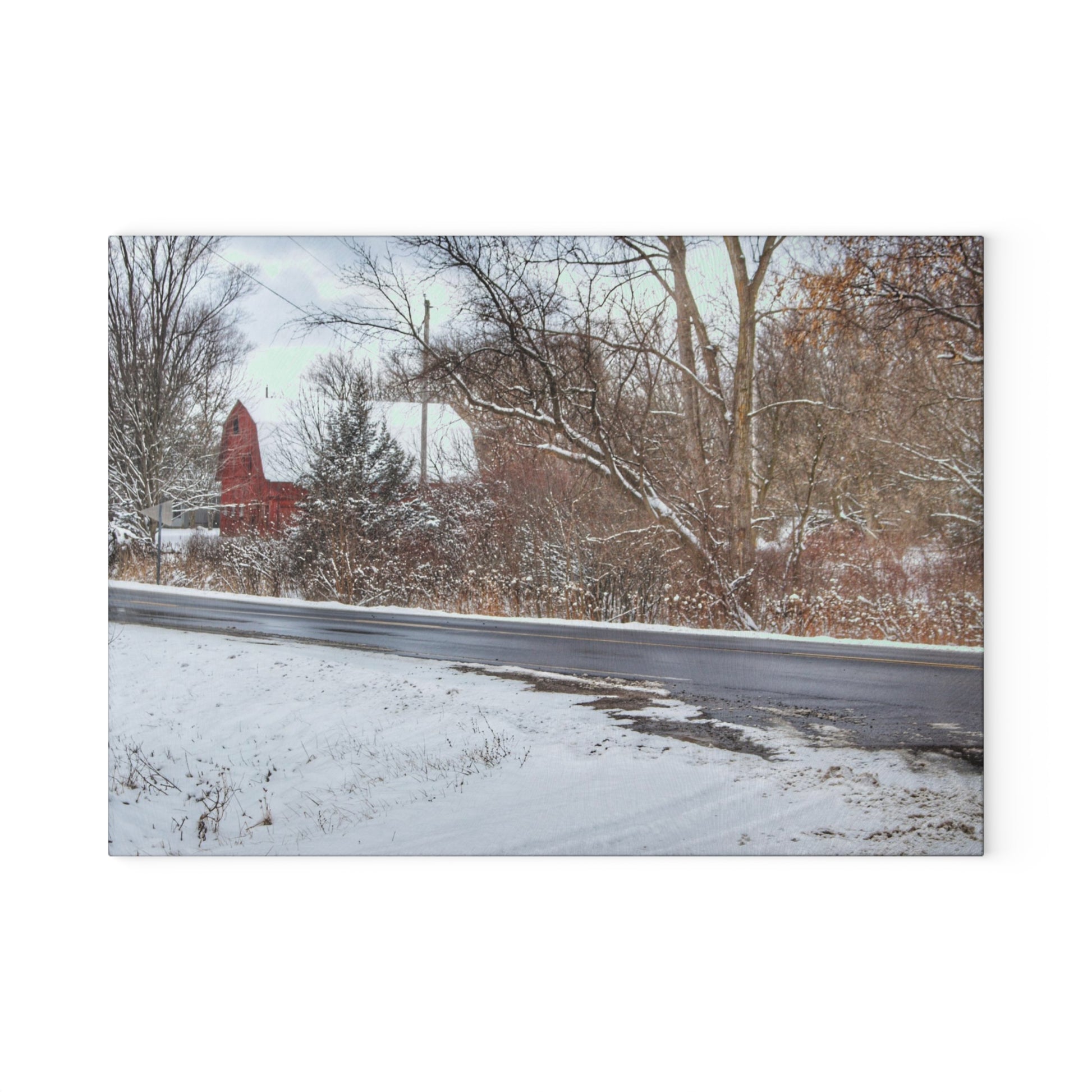 U R There Photography Dodge Road Winter Red Rustic Farmhouse Tempered-Glass Cutting Board