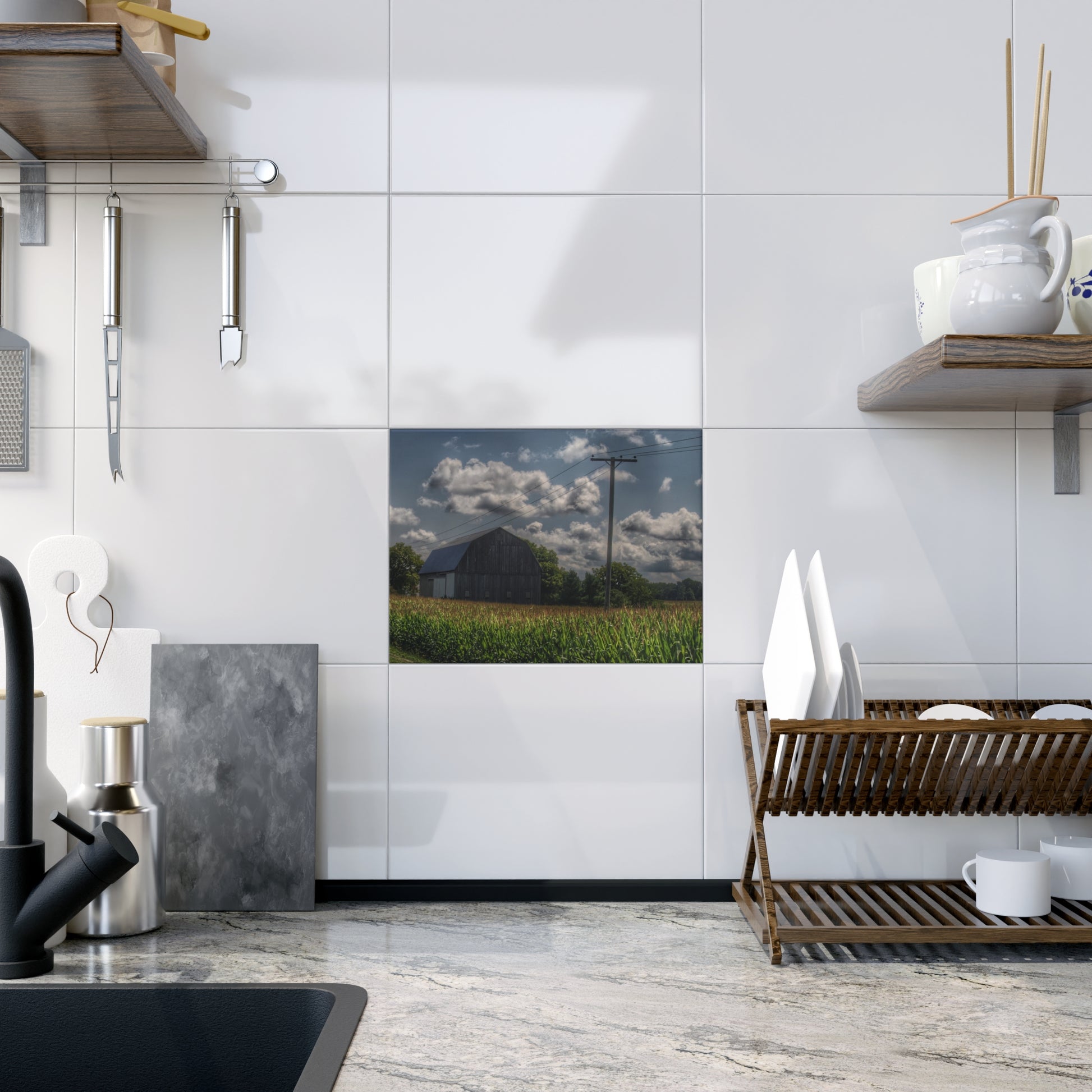 U R There Photography Grey Barn in a Cornfield Rustic Farmhouse Decorative Ceramic Tile