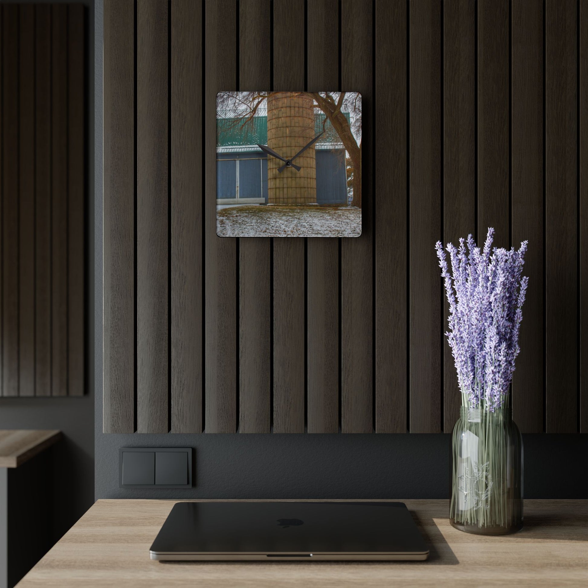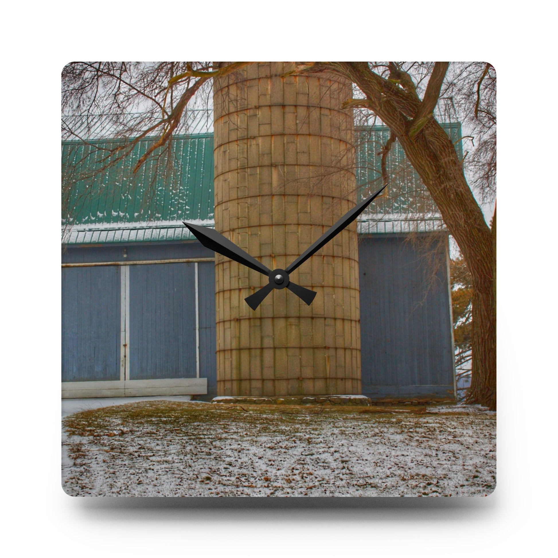 U R There Photography Hollow Corners Grey and Silo Rustic Farmhouse Acrylic Analog Wall Clock