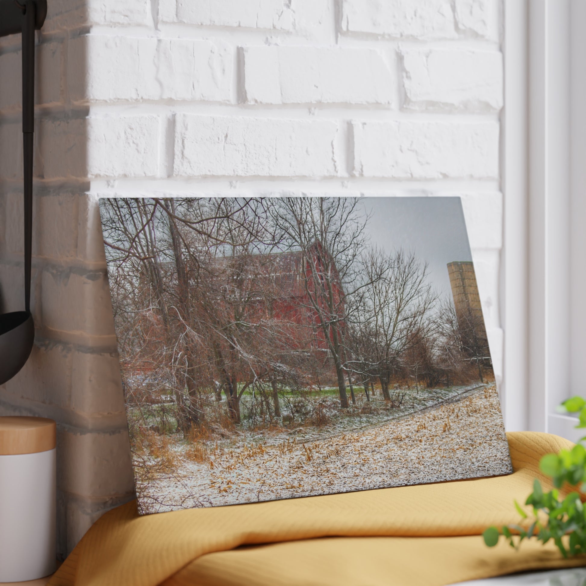 U R There Photography Hough Road Hidden Winter Red II Rustic Farmhouse Tempered-Glass Cutting Board