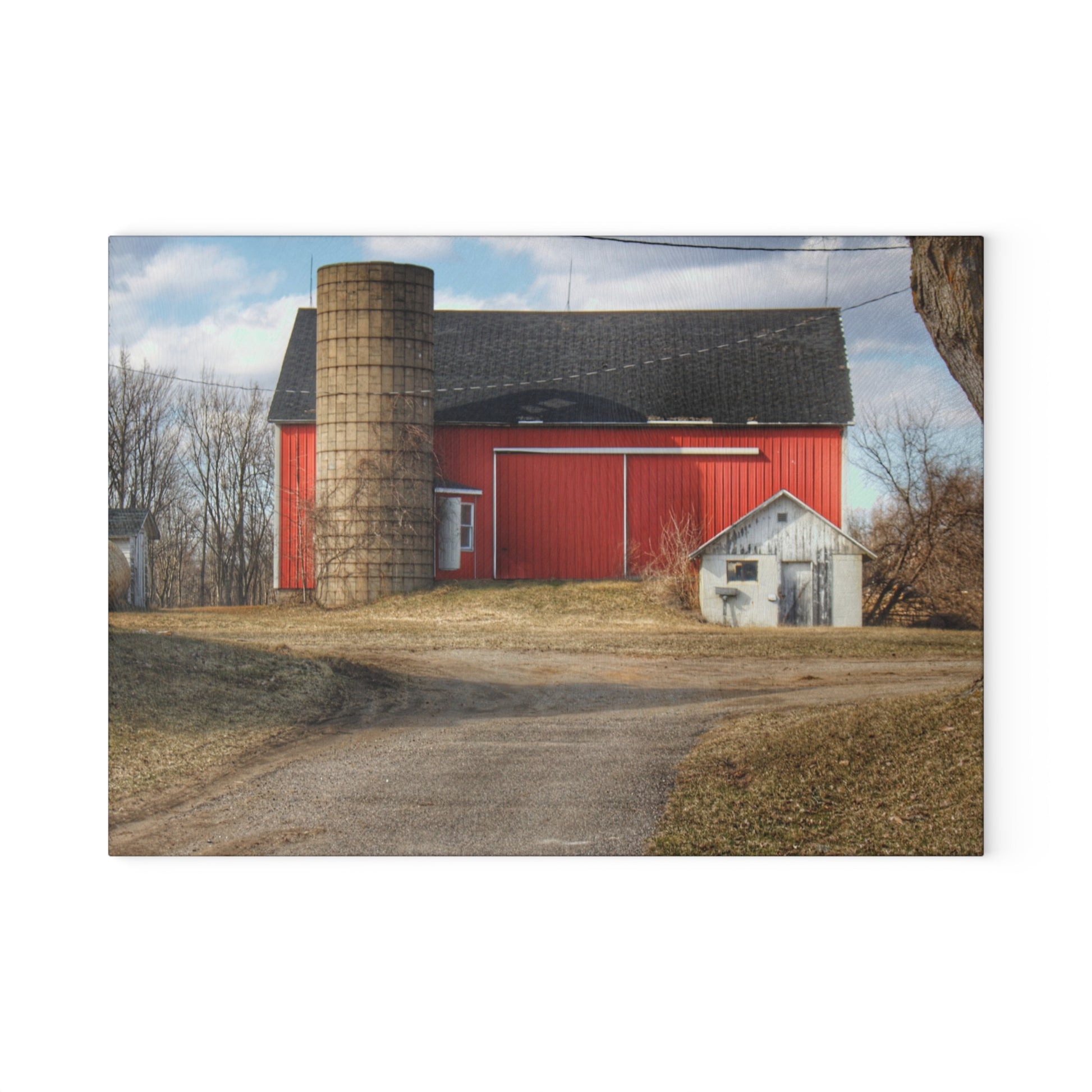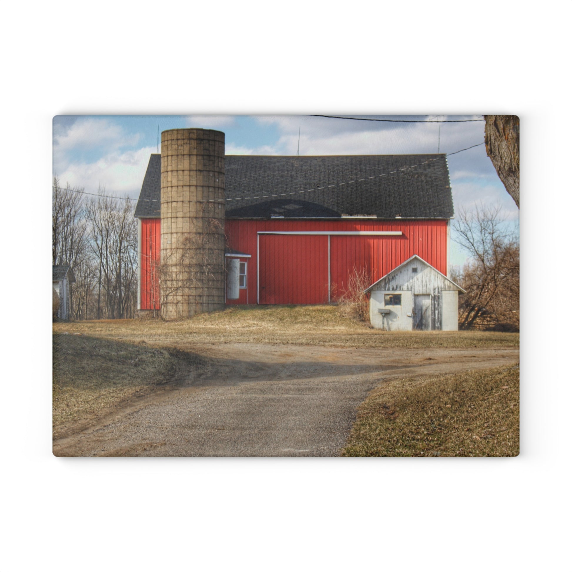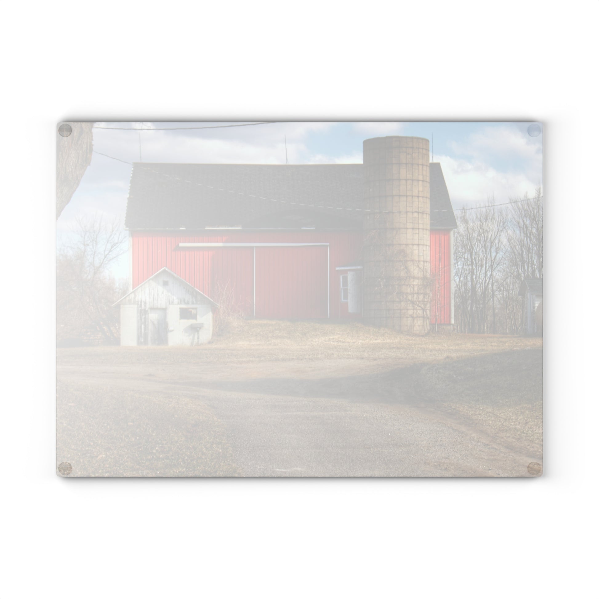 U R There Photography Mayville Road Red and Silo Rustic Farmhouse Tempered-Glass Cutting Board