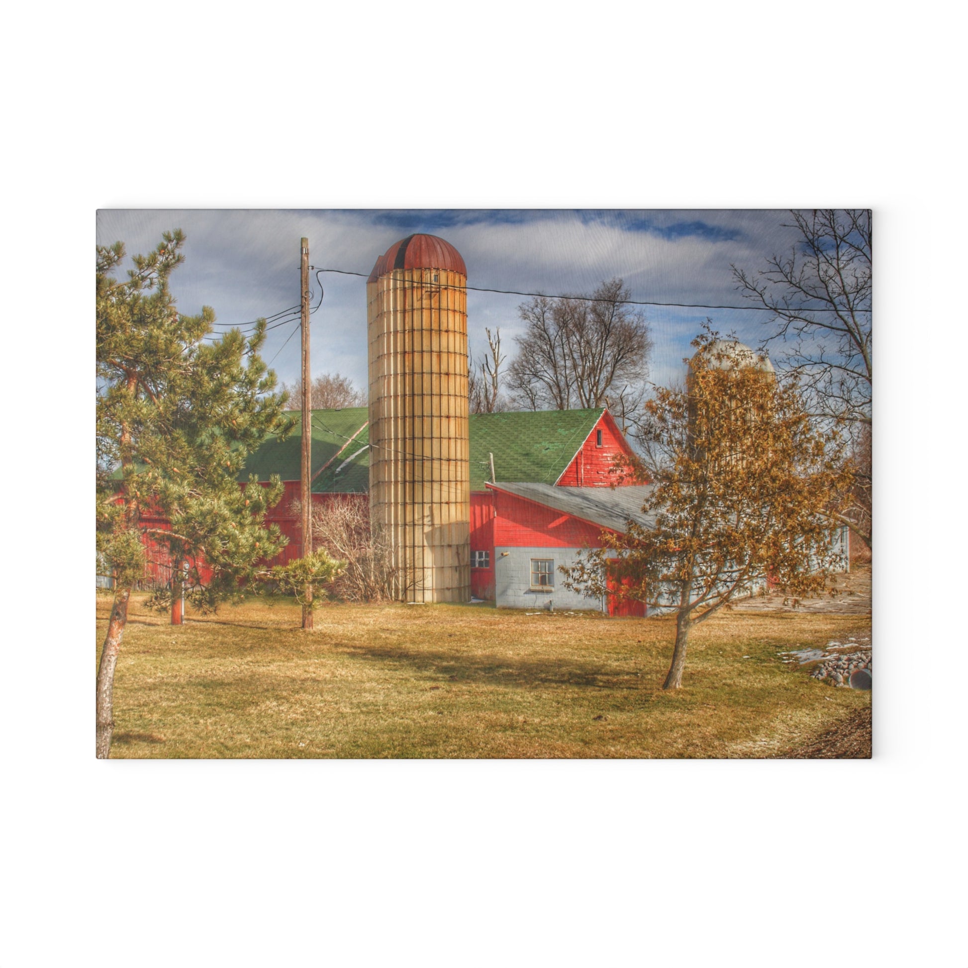 U R There Photography Newark Road Red and Silos II Rustic Farmhouse Tempered-Glass Cutting Board