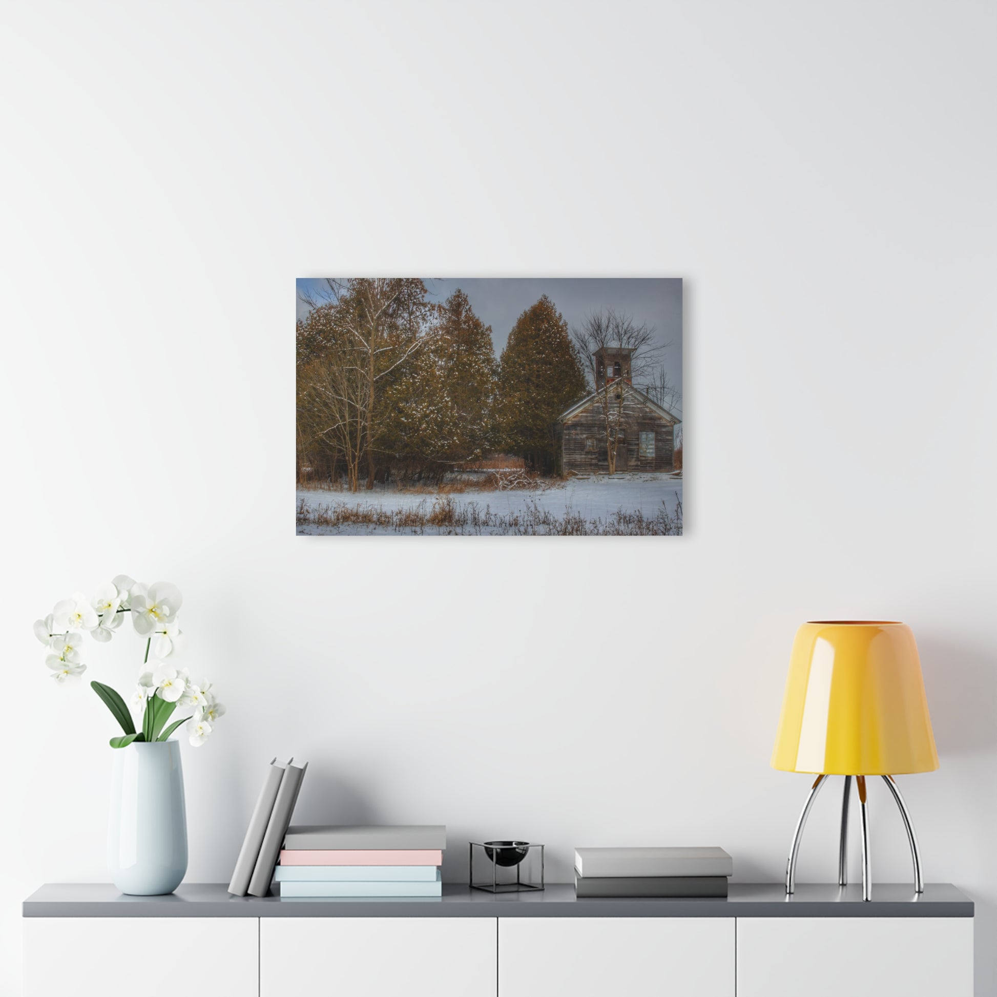 The snow-covered ground, marked by sparse, dry grasses that peek through the icy blanket, leads the eye toward the schoolhouse. The grasses, golden and brittle, add a touch of color to the otherwise monochromatic landscape. The uneven texture of the snow, with its subtle shadows and light reflections, creates a sense of depth and dimension, enhancing the overall atmosphere of stillness and quiet.